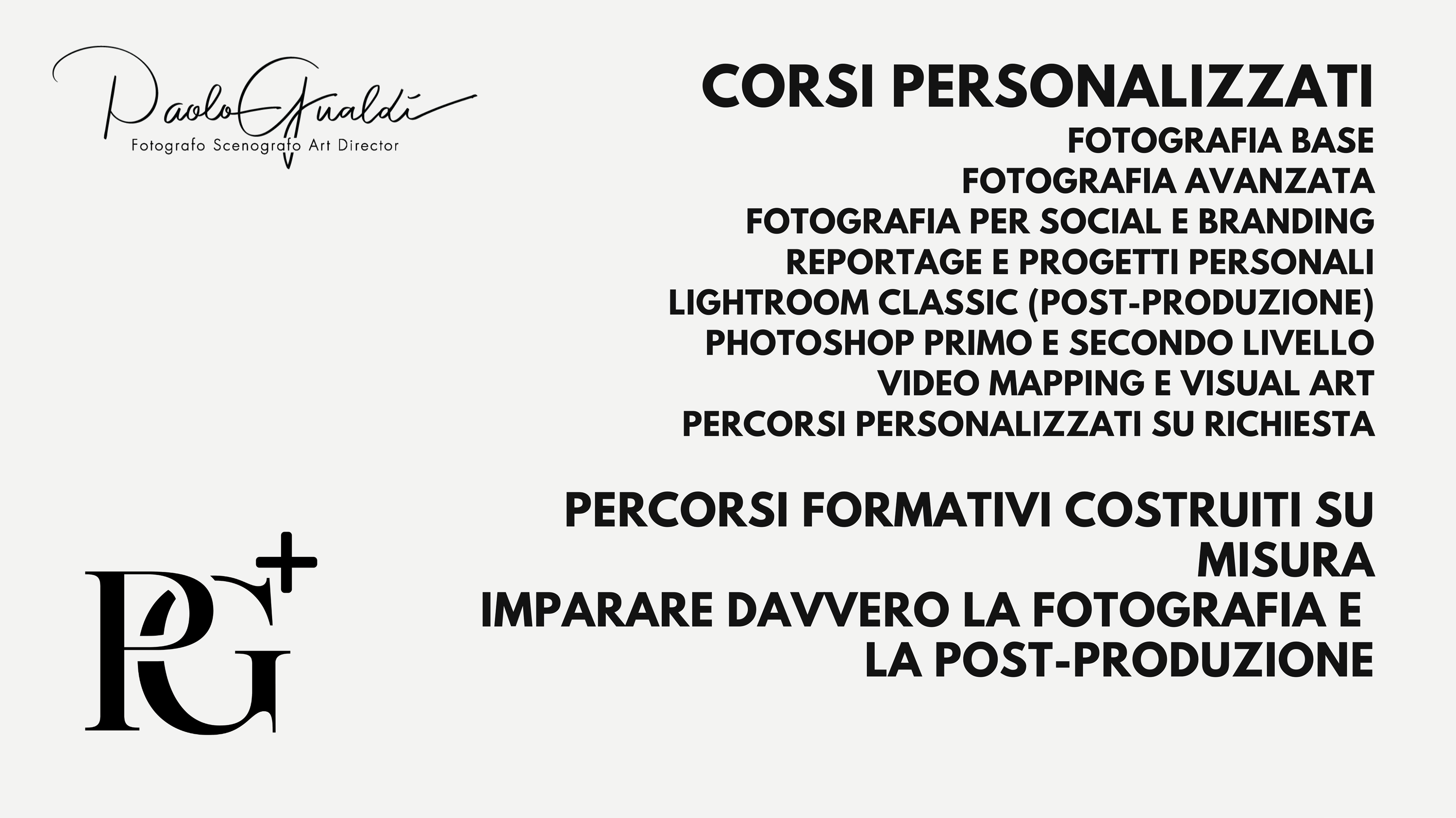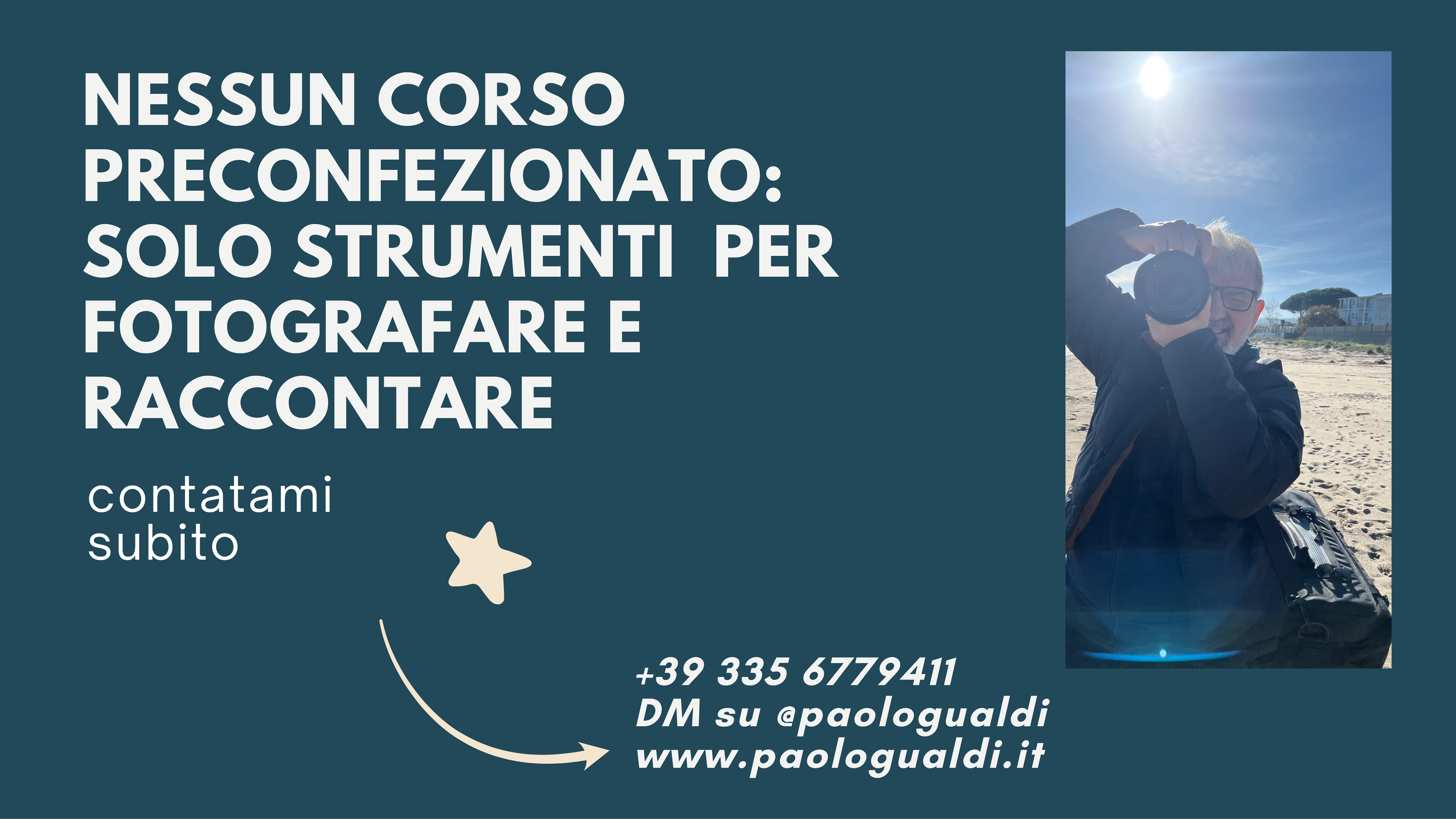 Che tu voglia iniziare, migliorare o specializzarti, qui trovi attenzione, flessibilità e un confronto costante. Nessun corso preconfezionato: solo strumenti utili per crescere nel tuo modo di fotografare e raccontare.